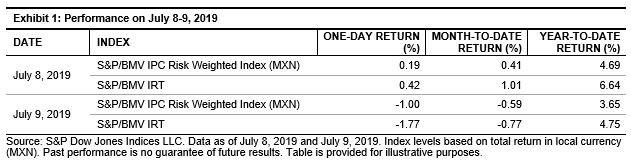 Mexico’s Finance Minister, Carlos Urzúa, abruptly resigned on July 9, 2019 over policy disagreements with the current government.[1] Market participants reacted negatively, generating volatility in the Mexican peso’s exchange rate, which fell 2.3% right after the announcement,[2] and the country’s equity market, and bringing a trial by fire for the S&P/BMV IPC Risk Weighted Index (MXN).
