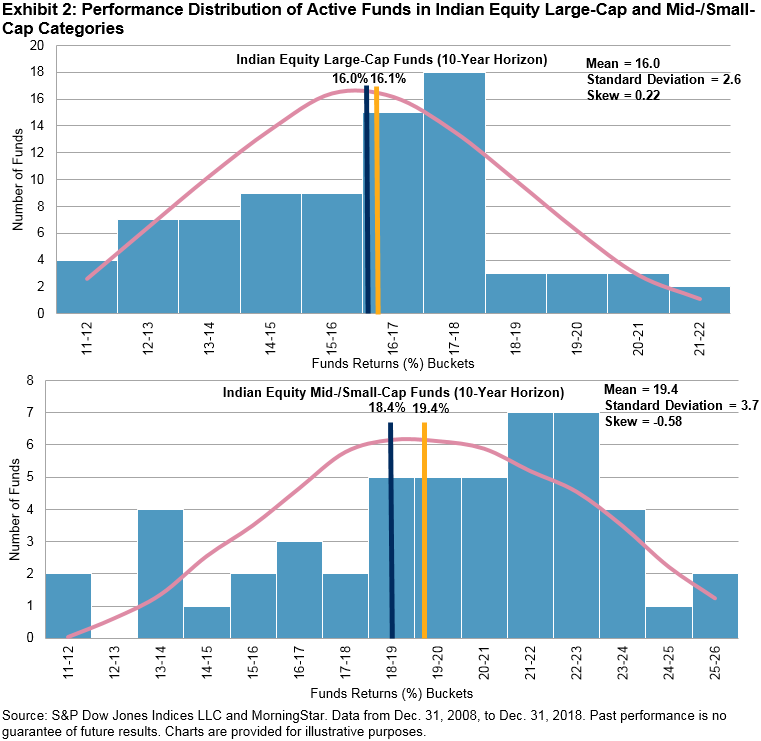 In the Indian Equity Large-Cap and Indian Mid-/Small-Cap categories, there was a wide spread in fund performance across different investment horizons (see Exhibit 1). For example, the spread in returns for an investor in two different large-cap funds over a 10-year horizon ending Dec. 31, 2018, could have been as high as 13.2% CAGR. Therefore, the selection of a fund can play a critical role in portfolio returns. The performance range in the case of the Mid-/Small-Cap category was even higher, at 14.92% over a 10-year horizon. The story remains the same across different time horizons. Furthermore, the average net returns generated by active funds were not far off from the benchmark returns (see Exhibit 1).