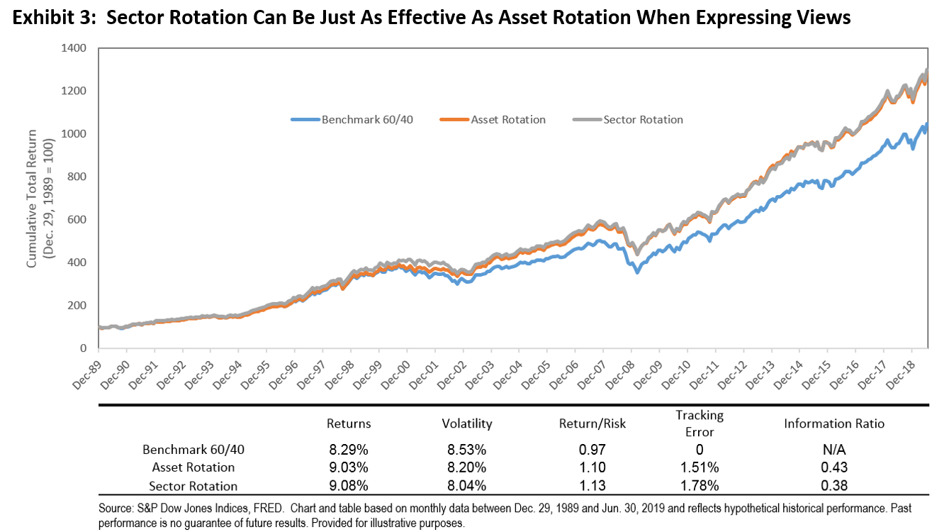 Exhibit 3 details the monthly relative returns from October 2018 to August 2019. Cumulatively, the S&P U.S. High Yield Low Volatility Corporate Bond Index outperformed the broad-based universe by 1.75%, with positive performance during 7 out of the 11 months over the studied period. Most of the outperformance came from credit spread positioning, confirming that uncompensated credit risk mitigation could improve the performance of a low volatility strategy.