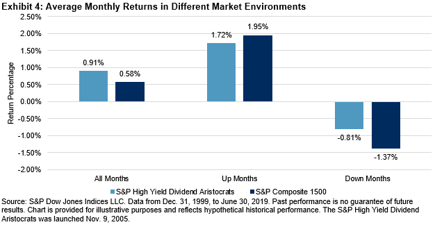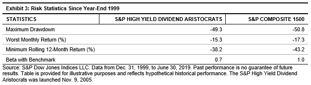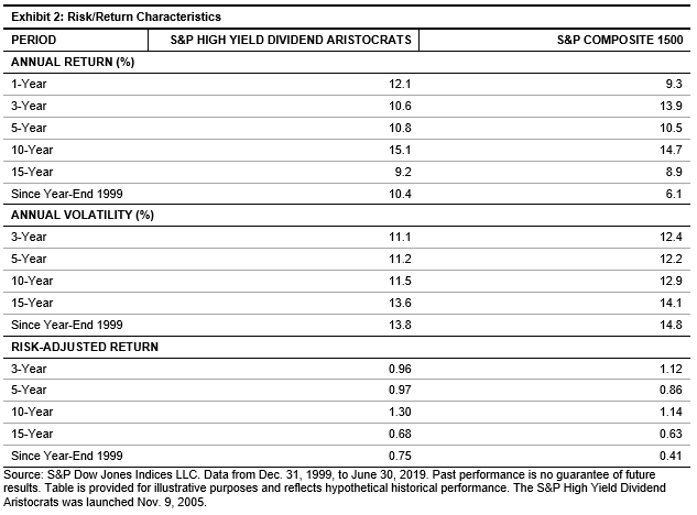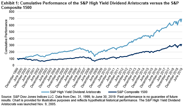 The S&P High Yield Dividend Aristocrats delivered significant outperformance against its benchmark, the S&P Composite 1500®, over the long-term horizon. Rebasing both indices to 100 on Dec. 31, 1999, the S&P High Yield Dividend Aristocrats reached 690.30 on June 30, 2019, whereas the S&P Composite 1500 reached 315.15 over the same period, as shown in Exhibit 1.