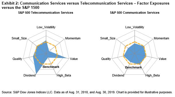 Based on the data from Exhibit 1, we observe that the volatility of Telecommunication Services was 69% higher than that of the S&P 500 in the year prior to the GICS changes. Since then, the volatility of Communication Services has been only 23% higher than that of the market, implying that Communication Services is much more market-like than its predecessor. We can see this firsthand through the factor exposures in Exhibit 2. Telecommunication Services had a high exposure to dividend yield and value. In stark contrast, Communication Services tilts away from dividend yield and low volatility, as well as away from small size, and is relatively more exposed to momentum and high beta. As a result, the sector now behaves more like the market.