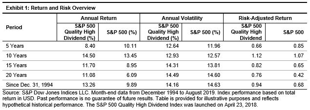 Focusing on quality and dividend yield, the S&P 500 Quality High Dividend Index has delivered significant outperformance over the long term relative to the broader market. In nearly 25 years of history, the strategy produced an annualized return of 13.26%, compared with 9.89% from the overall U.S. equity market as indicated by the S&P 500 (see Exhibit 1). Taking volatility into consideration, the S&P 500 Quality High Dividend Index offered a risk-adjusted return of 0.94, which is 38% higher than that of the S&P 500.