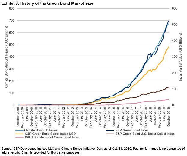 Derived from the same data, though organized for index use, the S&P Green Bond Index contains 5,774 bonds with a market value of USD 546 billion. Originally launched in 2014, the S&P Green Bond Index is a broad market index that is designed to measure the performance of green bonds regardless of size, coupon, or structure. The index and its subindices have grown in size as issuance has continued to increase for the green bond market.