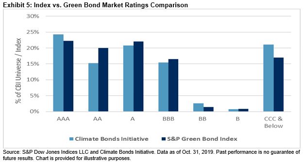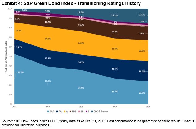 Like the green bond market, the top countries in the S&P Green Bond Index are the U.S., France, and China, which make up 17%, 14%, and 9% of the index’s weight, respectively. The ratings within the index have transitioned from the historic AAA of supranational, which in the past consisted of heavy issuers of green bonds, to its current breakdown, seen in Exhibits 3 & 4.