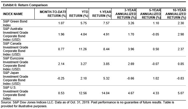 Exhibit 6 compares the 1-, 3-, 5-, and 10-year returns of the S&P Green Bond Index, of which corporates was around 50% for the index and the market. Since the majority of credits for the index and the overall market were investment grade (80%), Exhibit 4 compares investment-grade corporates in USD terms.