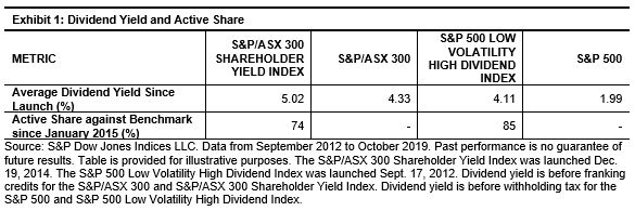 The trailing 12-month dividend yield averaged 5.02% for the S&P/ASX 300 Shareholder Yield Index from its launch in December 2014 to October 2019 (see Exhibit 1). The S&P 500 Low Volatility High Dividend Index also posted an impressive 4.11% average dividend yield from its launch in September 2012 to October 2019.