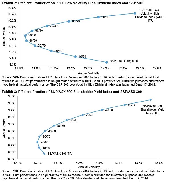 Over the past 15 years, a 100% S&P 500 portfolio generated 8.9% annual total return, with 12.3% annualized volatility (in AUD; see Exhibit 2). When the allocation moved to the S&P 500 Low Volatility High Dividend Index by 10%, 20%, 30%, etc., the risk/return point moved toward the top left of the original portfolio, which means higher return and lower risk. For example, at the 50/50 allocation, the total return increased 80 bps to 9.7% per year and volatility decreased to 11.8%.