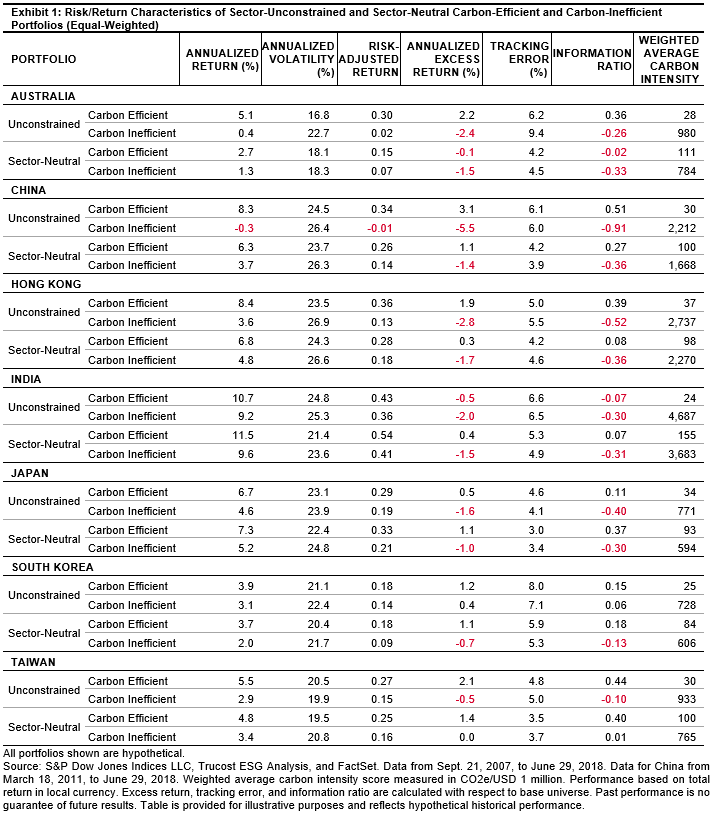 In our research paper, Integrating Low-Carbon and Factor Strategies in Asia, we constructed pure factor portfolios (momentum, value, quality, and low volatility) and studied the impact of carbon screening on these portfolios in seven Asian markets—Australia, China, Hong Kong, India, Japan, South Korea, and Taiwan. The pure factor portfolios were constructed by selecting the top quintile of stocks by factor scores from each market from their respective base universe. The carbon-efficient factor portfolios included the same number of stocks as in their respective pure factor portfolios, but were selected from the carbon-screened universe, from which the 33% of stocks with the highest carbon intensity scores were removed. The pure factor and carbon-efficient portfolios were unconstrained by sectors and were equally weighted. The carbon-efficient screening affected the performance and carbon intensity of each factor portfolio differently (see Exhibit 1).