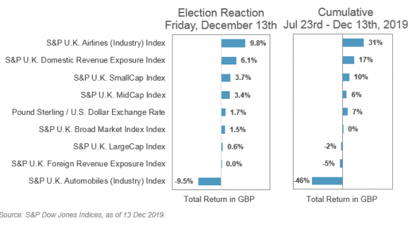 For once, the polls largely got it right. A conservative majority had been predicted ever since Johnson’s elevation to Prime Minister on July 23rd, 2019; the market’s reaction on Friday continued along the line of established trends. Exhibit 2 shows selected winners and losers from Friday’s trading, as well as the cumulative performance of the same indices since the mid-summer.