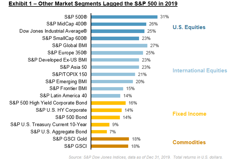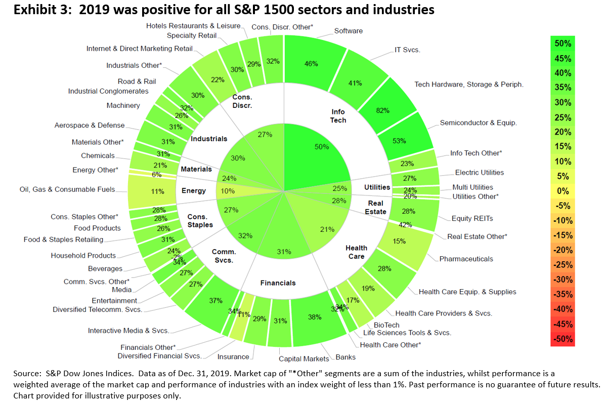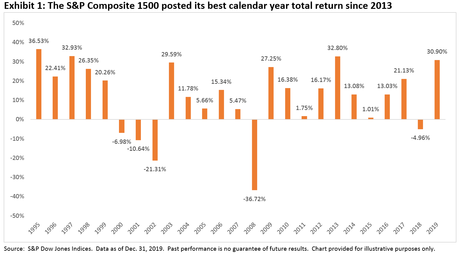 The S&P Composite 1500 measures the U.S. equity market by combining three world-renowned benchmarks – the S&P 500®, S&P MidCap 400®, and S&P SmallCap 600® – which together encompass approximately 90% of U.S. equity market capitalization.  With 2019 in the rear-view mirror, it is obvious that last year was extremely positive for U.S. equities:  the S&P 1500 recorded its best calendar year total return since 2013, up 30.90%.  While this performance may not be surprising given the healthy gains posted by most size, sector, and style segments, it reflects a few broader market trends.