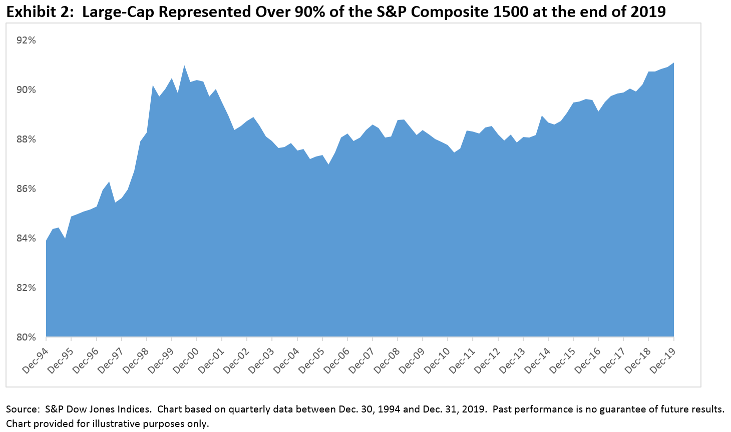 Large-cap stocks have outperformed their mid- and small-cap counterparts in every year since 2016 and this continued through 2019:  the S&P 500 (+31.49%) beat the S&P MidCap 400 (+26.20%) and the S&P SmallCap 600 (+22.78%) last year.   This continued outperformance meant that the collective weight of S&P 500 constituents in the S&P Composite 1500 – as measured at quarterly intervals between the end of 1994 and 2019 – hit an all-time high of 91% in December 2019.  This helps to explain why the S&P Composite 1500 outperformed the mid- and small-cap market segments last year.