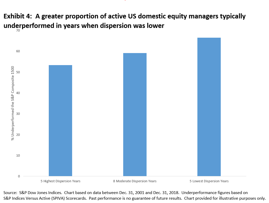 Given the below-average dispersion in the S&P 1500 last year, most active managers may find it challenging to outperform the U.S. equity market benchmark.