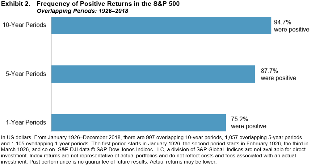 Despite the year-to-year volatility, investors can potentially increase their chances of having a positive outcome by maintaining a long-term focus. Exhibit 2 documents the historical frequency of positive returns over rolling periods of one, five, and 10 years in the US market. The data show that, while positive performance is never assured, investors’ odds improve over longer time horizons.