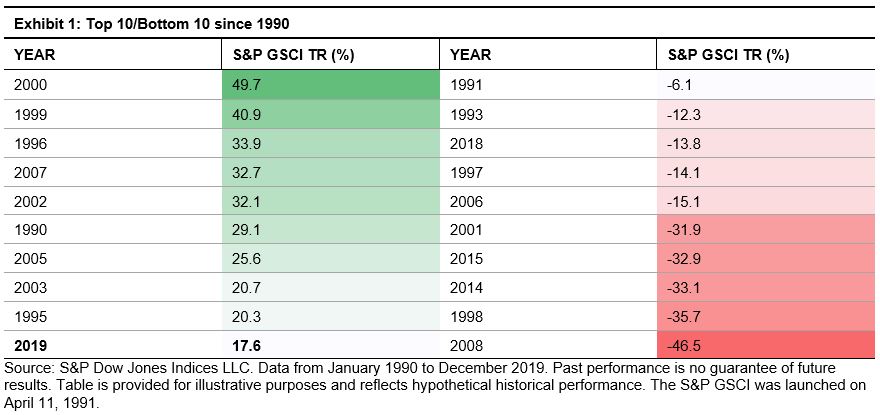 The S&P GSCI ended 2019 up 17.6%. This was the S&P GSCI’s 10th-strongest performance since 1990 and its best annual return since the heights of the so-called commodity super cycle in 2007. Across the commodity markets, gains were driven by the petroleum complex and precious metals, while agriculture and livestock detracted from headline performance.