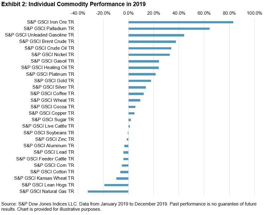 Gold proved one of the most popular assets for investors in 2019. The S&P GSCI Gold posted its best performance since 2010, gaining 18.0%, driven by safe-haven buying powered by escalating geopolitical tensions, a protracted trade war, and quantitative easing by major central banks. As more government bonds across the globe displayed negative yields throughout 2019, gold remains well positioned as a safe-haven alternative for investors going into the new year. The S&P GSCI Palladium ended the year 64.3% higher, continuing a multi-year price appreciation driven by its use in car exhaust to defuse emissions.
