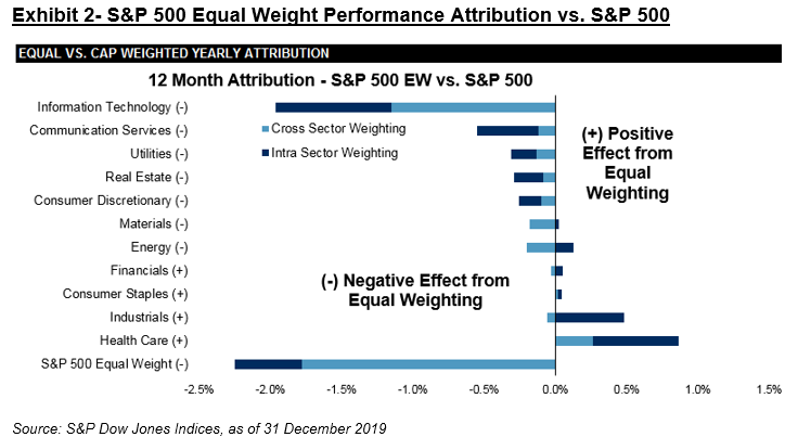 The performance of equal-weight indices provides an easy way to analyse the importance of size in stock and sector selection.  S&P 500 Equal Weight Index has the same constituents as the S&P 500, but weights each constituent equally, with the result that the sector allocations are also more balanced.  As illustrated in the latest S&P Equal Weight Sectors Dashboard, both underweighting the largest sectors and weighting equally within each sector helped to contribute to the 2.3% underperformance of the S&P 500 Equal Weight index in 2019.  In fact, sector allocations were responsible for the lion’s share of underperformance – with an underweight in the tech sector accounting for over 1% of the drag.