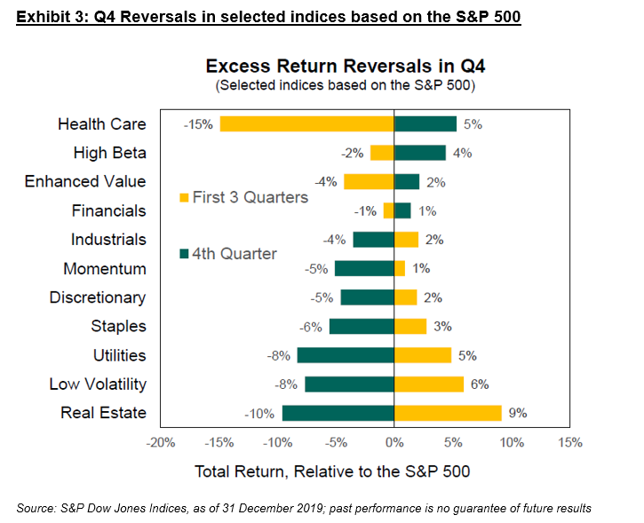 But …  some parts of the market must have outperformed?  If you didn’t overweight the largest sectors and stocks, the sting in the tail of the market’s performance this year was that, beyond portfolio construction, a degree of timing was also required to maintain outperformance.  As we highlighted in our year end S&P 500 Factor Dashboard , for several areas of the market, there were major reversals into the year end: the Health Care sector, for example, underperformed the S&P 500 by 15% in the first three quarters, and then outperformed by 5% in Q4.  In September, the S&P 500 Low Volatility Index looked certain to finish the year on top, but failed to keep pace with the fourth quarter’s rally.