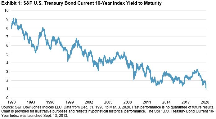For those wondering what role fixed income would have in their portfolio at record-low yields, they had to wait just one week. On Friday, Feb. 21, 2020, we hit a record-low yield for the 30-year Treasury, as the S&P U.S. Treasury Bond Current 30-Year Index yield fell to 1.92%. The next week, the Dow Jones Industrial Average proceeded to shed over 3,500 points and Treasuries maintained their safe haven status. Following an emergency 50 bps rate cut by the Fed, the 10-year set an all-time low, falling below 1% for the first time. The double digit returns in bonds YTD continue to buffer losses in investors’ portfolios.