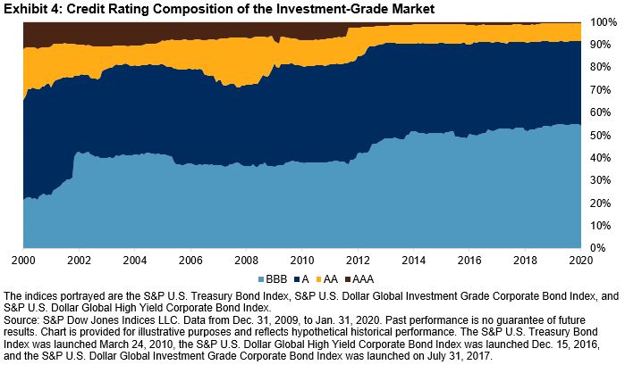 The continual downward march in yields has created large shifts in the fixed income market structure, affecting investors who benchmark their portfolios to indices. Borrowers, for the most part, have taken advantage of lower rates to issue debt at lower levels, which lowers the potential return for investors. The coupon rates for fixed income indices have fallen 1%-2% over the past decade (see Exhibit 2). Ten years ago, investment-grade issuers were paying an average coupon of around 6%, while that is closer to what high-yield issuers pay today. While coupons have fallen, the interest rate risk has risen, as measured by modified duration. Borrowers have issued longer dated debt, increasing the index average by nearly 30% and 40% for investment grade and Treasury indices, respectively (see Exhibit 3). While interest rate risk has gone up, credit risk, as measured by the average credit rating of investment-grade issuers, has also increased (see Exhibit 4). BBB-rated securities account for 54% of the investment-grade market, up from 21% in 2000.