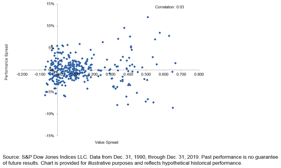 Scatter Plot of Monthly Relative Value Scores and S&P 500 Low Volatility Index Performance Spread in Subsequent Month Depicts No Relationship