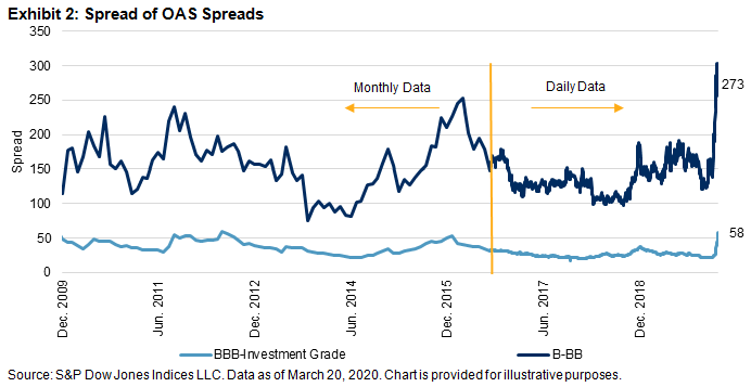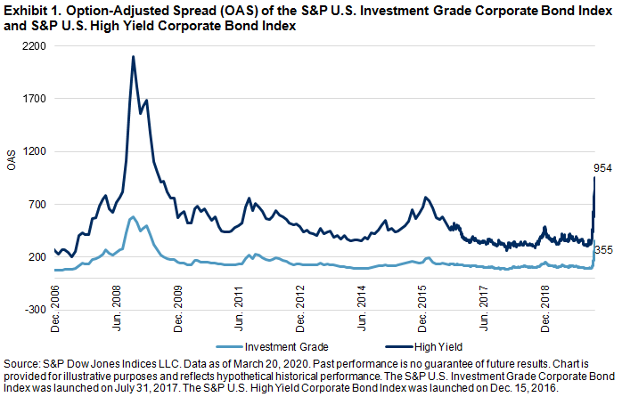 Since mid-February, the market has turned sharply down in response to the coronavirus pandemic. The S&P 500® has fallen about 32% from its peak this year. Equity volatility shot up, as VIX® went from historical lows to the 70-80 range, which was last seen in November 2008. The 10-year U.S. Treasury Bond yield reached 0.32% intraday before it bounced back above 1%, as the market expected more debt issuance with drastic fiscal measures to combat the economic slowdown. How has U.S. corporate debt weathered this market storm so far?