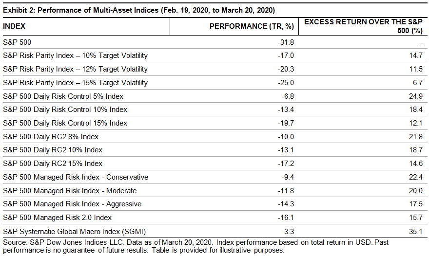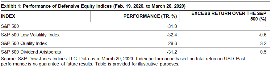 In January 2019, we highlighted several indices designed to reduce the impact of large equity market drawdowns. Here we analyze the same suite of indices divided across three broad categories: defensive equity, multi-asset, and volatility. This analysis simply reviews performance since the S&P 500®’s high on Feb. 19, 2020, through the close on Friday, March 20, 2020.[1]