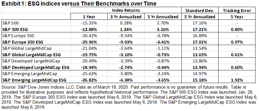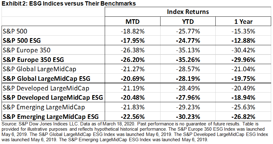Will the S&P 500 ESG Index continue to track and even improve on the performance of the S&P 500 in the future? Common sense and our lawyers prevent us from speculating, but it appears that the ESG indices are passing major tests—their first year live, their first rebalance, and their first bout with market volatility—even better than expected.