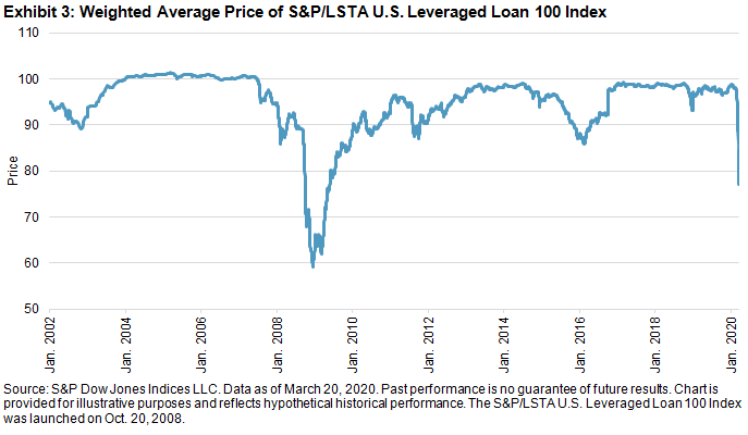 How did corporate bonds with different credit quality perform during this market stress? Exhibit 2 charts the spread difference between spreads of investment grade versus ‘BBB’ and ‘BB’ versus ‘B’. The widening of spreads between rating buckets has been consistent with the direction of spread widening, and the fact that the spread between ‘BB’ and ‘B’ has reached a new post-GFC high is very concerning. In fact, the weighted average price of leveraged loans dropped to 77.06 on March 19, 2020, a new low since the rally after 2009 (see Exhibit 3). Market participants may now wonder about the funding and default risk ahead.