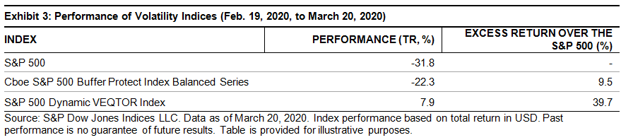 Source: S&P Dow Jones Indices LLC. Data from February 29, 2020, to March 20, 2020. Past performance is no guarantee of future results. Chart and table are provided for illustrative purposes.