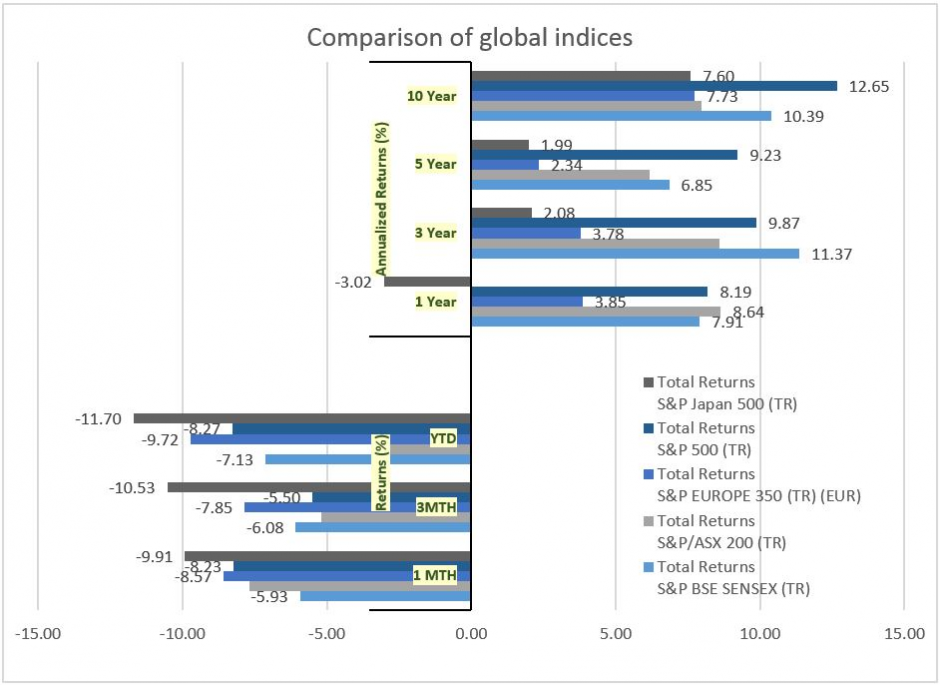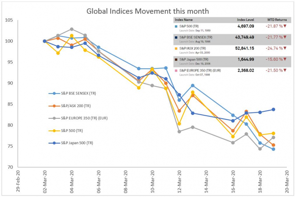 The effect of the coronavirus has transformed global and local markets, as well as their behavior. We are witnessing a similar pattern in equities markets across the world, be it the S&P 500® in the U.S., the S&P BSE SENSEX in India, the S&P/ASX 200 in Australia, the S&P Japan 500 in Japan, or the S&P Europe 350®. Fig 1 shows the trends from February 29, 2020, to March 20, 2020.