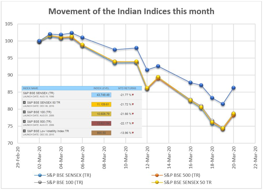 The week ending March 20, 2020, marked one of the worst weeks for the Indian equities market, with the S&P BSE SENSEX witnessing record lows. The index recovered 5% to close at 29,915 (price return [PR]) on Friday, March 20, 2020, but it was still 17% down as compared with the week before, when it was at 34,103 (PR) on March 13, 2020. Historically, the last time the S&P BSE SENSEX witnessed such large fluctuations was on May 18, 2009, when the index gained 2,110 in a single day, increasing 17.34%.