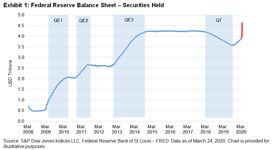 There’s no telling exactly what this amount could climb to, given that the objective is to purchase “amounts needed to support smooth market functioning and effective transmission of monetary policy to broader financial conditions and the economy.”1 Exhibit 1 shows the securities held on the Fed’s balance sheet since 2008 through prior QE phases and the 17-month period of quantitative tightening that began in 2017. The red line shows the rapid expansion taking place the week of March 23.