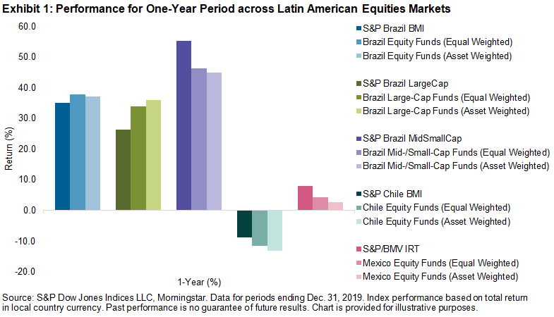 The SPIVA® Latin America Year-End 2019 Scorecard was released last week, showing divergent results for Latin American equities markets. The report covers Brazil, Chile, and Mexico in selected fund categories. In the framework of stable inflation, a decline in unemployment, and lower interest rates, 2019 was a great year for Brazilian equities markets, as measured by its benchmarks across three fund categories; the S&P Brazil BMI returned 35%, the S&P Brazil LargeCap returned 26%, and the S&P Brazil MidSmallCap returned 55%. Compared with Brazil, Mexico’s equities market was positive, but with moderate results; the S&P/BMV IRT increased 2%. The case of Chile was much more unfortunate, especially considering the recent social unrest, with the S&P Chile BMI falling 8.8% during the 12-month period ending on Dec. 31, 2019.