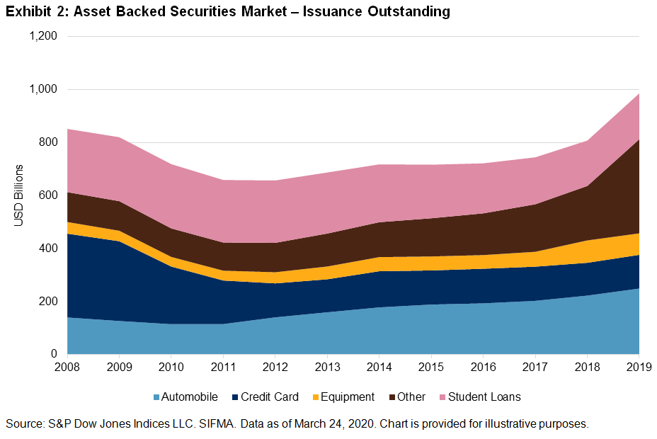 Another tool from the GFC, the TALF will “enable the issuance of asset-backed securities (ABS) backed by student loans, auto loans, credit card loans, loans guaranteed by the Small Business Administration(SBA), and certain other assets.”1 Exhibit 2 shows the current composition of the asset-backed securities market and its growth following the GFC.