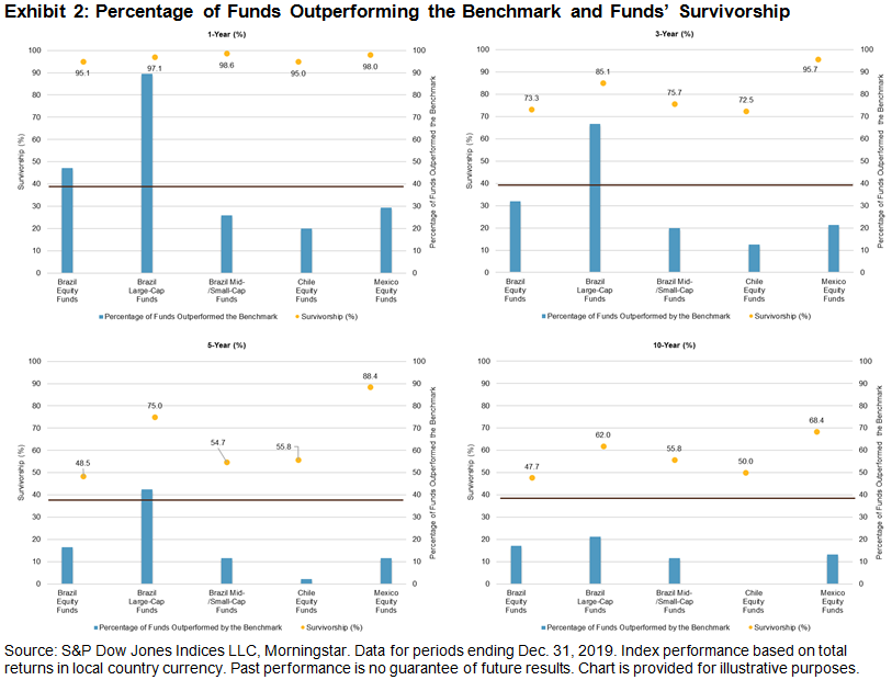 The rise in the Brazilian equities markets lead to active large-cap fund managers’ outperformance against the S&P Brazil LargeCap during the one- and three-year periods, although they couldn’t repeat the performance for longer-term periods. Mexican active equities fund managers and Chilean active equities fund managers failed to beat their benchmarks over the one-, three-, five-, and ten-year periods (see Exhibit 2). Mexican funds led survivorship across the four observation periods.