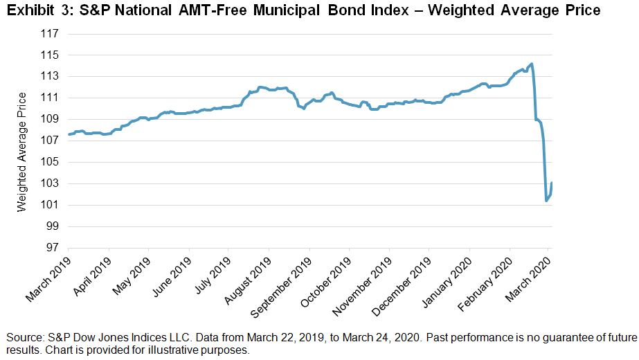This will have a greater impact on money markets than on municipalities, as state and local governments will most likely require more direct intervention. However, Exhibit 3 shows that the announcement encouraged some price support in the broad municipal bond market.