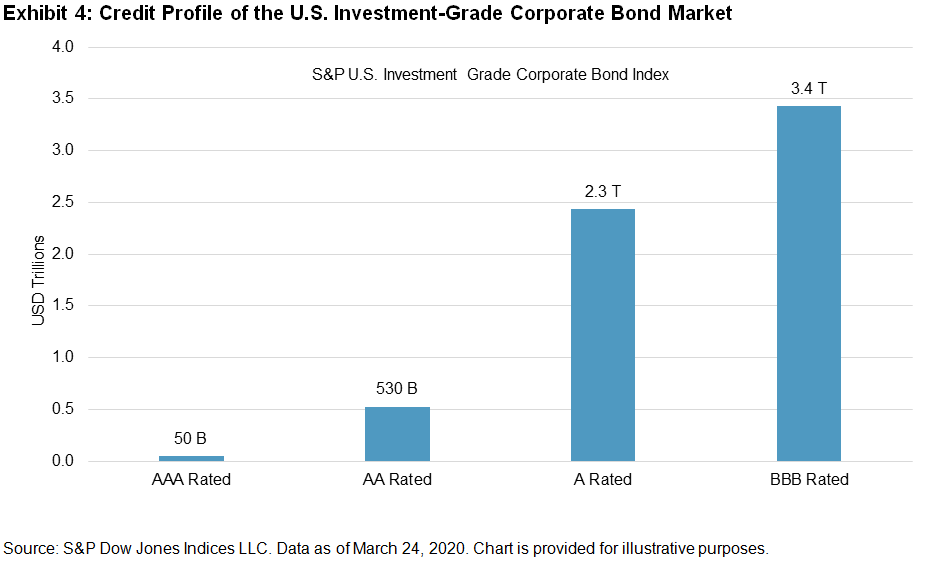 The FOMC is prohibited from selecting specific corporate issuers, and they can only purchase bonds with a rating of BBB- or higher. Exhibit 4 shows the current credit profile of the U.S. investment-grade corporate bond market. Of the USD 6.3 trillion of corporate bonds, more than 55% are rated BBB. While both facilities will surely grow in size to support the market need, the greater risk is the further degradation of credit quality of the USD 3.4 trillion of corporate bonds outstanding.