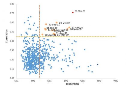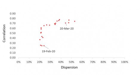 This makes fundamental economic sense, of course, since correlation measures the degree to which the components of the index move together.  A pandemic of still-unknown duration and severity can be expected to affect every business adversely.  The degree of adversity will obviously vary across industries, with some (e.g., airlines and hotels) suffering more than others (which accounts for heightened dispersion).  But almost all will move down, driving correlations higher.