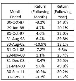 Exhibit 4 identifies each month in which dispersion was above average and correlation was elevated (above 0.45), and asks what happened in the aftermath of the market’s reaching those levels.  There have been 11 such months since 1971; in every case the market was higher a year later, with an average gain of 24%.