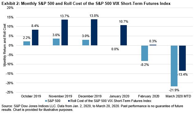 Exhibit 1 shows the VIX term structure on Jan. 2, 2020 (in contango) and on March 20, 2020 (in backwardation). In the first case, the S&P 500 VIX Short-Term Futures Index sold first-month futures at USD 14.08 and bought the same second month portion at USD 16.13, incurring a per-unit roll cost of USD 2.05. While on March 20, 2020, the daily roll of the index would sell higher at USD 61.53 and buy lower at USD 56.63, thus enjoying a per-unit profit of USD 4.90. Since VIX futures were backwardated for almost a month, this additional roll return was not negligible.