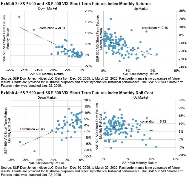 Exhibit 3 shows that the negative correlation between the S&P 500 VIX Short-Term Futures Index and the S&P 500 is stronger in a bear market than in a bull market. Interestingly, the correlation between its monthly roll cost and the equities market is also much stronger when the market goes down (see Exhibit 4). Thus, in a stressed market, it is more likely that the VIX futures term structure will be backwardated and investors will benefit from the daily roll of the index.