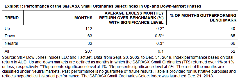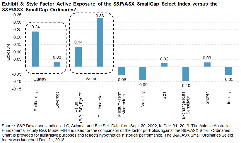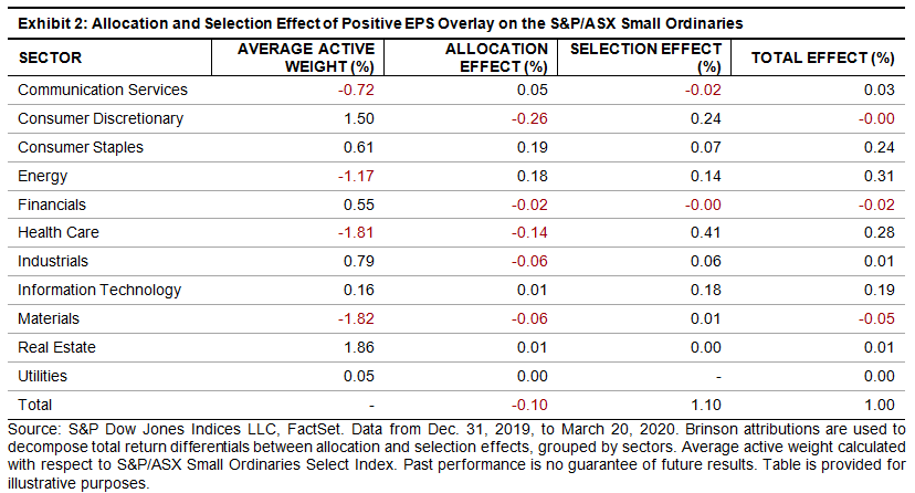 As highlighted in the research paper, the S&P/ASX Small Ordinaries Select Index tended to outperform the benchmark during down and neutral markets (see Exhibit 1). The defensive characteristic of the S&P/ASX Small Ordinaries Select Index was also seen in the recent market downturn. During the period from Dec. 31, 2019, to March 20, 2020, the underlying index fell 30.5%, whereas the select strategy fell by 29.5%, outperforming the benchmark by 100 bps. The outperformance of the S&P/ASX Small Ordinaries Select Index was largely driven by stock selection within sectors (see Exhibit 2). Stock selection in the majority of the sectors attributed positively to the S&P/ASX Small Ordinaries Select Index’s relative performance, where attribution from Health Care and Consumer Discretionary stocks were most pronounced. Nevertheless, the unintended sector bets had marginal negative attribution to the S&P/ASX Small Ordinaries Select Index’s return. The select version of the index carried the highest active sector exposures to Real Estate and Consumer Discretionary, while it was most underweight in Materials and Health Care. The overweight in the Consumer Discretionary sector hurt the S&P/ASX Small Ordinaries Select Index’s performance, but the active sector bets in Consumer Staples and Energy attributed most positively to its return.