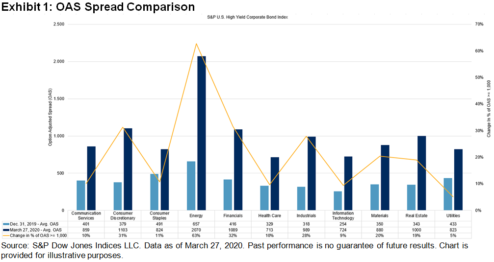 Moving down the credit scale and looking at more speculative-grade securities, the effects are even greater. Year to date, the S&P U.S. High Yield Corporate Bond Index has seen a fair amount of spread widening, as seen in Exhibit 1. In addition to the movement in OAS spreads, the amount of debt per sector that is at or above an OAS of 1,000 (distressed) has also increased since the beginning of the year. Distressed bonds will be an early indicator of issuers that may end up in default.