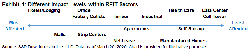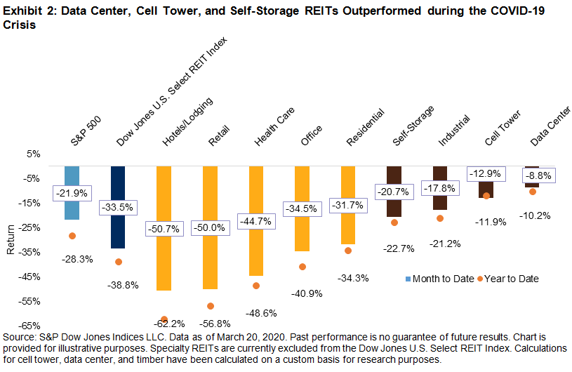 Cyclical sectors such as hotels and malls took the brunt of the impact due to their direct dependence on consumer spending. The substantially weakened demand for travel, dining out, lodging, and shopping resulted in hotel and retail REITs suffering more than a 50% loss MTD through March 20, 2020, compared with -21.9% and -33.5% from the S&P 500 and Dow Jones U.S. Select REIT Index, respectively (see Exhibit 2). Health Care REITs, which focus on investing in medical offices and senior housing, declined 44.7% MTD. Increased visits to hospitals made medical buildings less affected compared with senior housing, which took a harder hit because of residents being from a high-risk demographic and delaying moving in to the senior community. This outbreak also pushed more companies to adopt a work-from-home policy, causing reduced demand for office spaces, which led to a 34.5% sell-off in office REITs MTD.