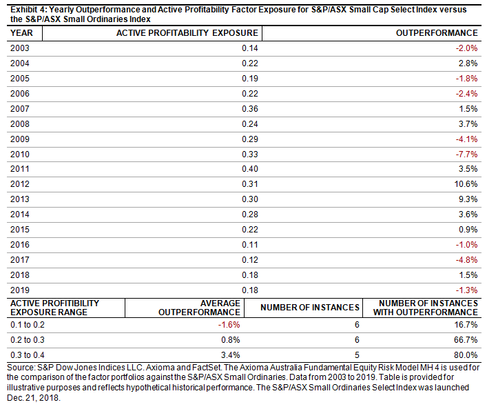 In the research paper, we also mentioned the S&P/ASX Small Ordinaries Select Index had a higher profitability active factor exposure than the S&P/ASX Small Ordinaries Index historically. In addition, the S&P/ASX Small Ordinaries Select Index offered higher dividend yields compared with the benchmark, as profitable companies are better positioned to maintain sustainable dividends. Exhibit 3 shows the active factor exposures averaged over the 17-year period since 2002 to 2019. Stock selection based on trailing EPS effectively captured positive profitability exposure for the S&P/ASX Small Ordinaries Select Index every year. As market conditions changed, so did the profitability active factor exposure. We observed in years when the profitability factor exposure was higher, the S&P/ASX Small Ordinaries Select Index tended to have better outperformance, indicating profitability was a determinant factor in driving outperformance of the select index (see Exhibit 4).
