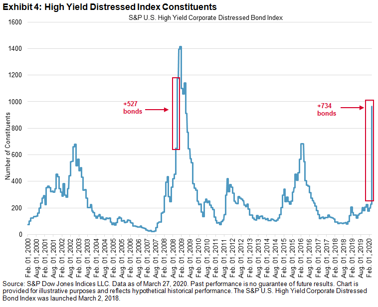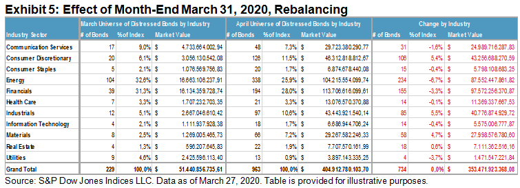 As can be seen in Exhibit 4, the index is going to jump from its current 229 bonds to 963 bonds at the March 31, 2020, rebalancing. This will be the largest number of bonds entering the index at a rebalancing since the Oct. 31, 2008, rebalancing. The percent of distress within high yield will be 30% of market value, or 963 bonds out of the high yield April universe of 2,314 (42%).