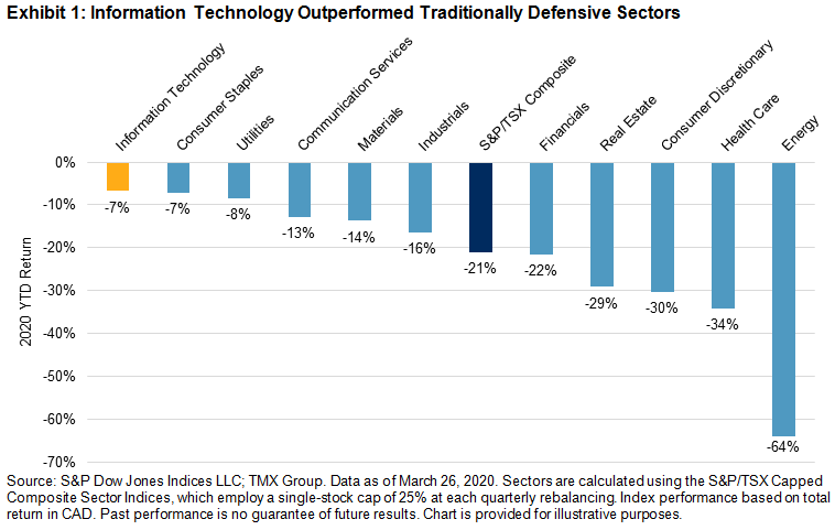 The S&P/TSX Capped Information Technology Index gained a whopping 62% in 2019, topping all other Canadian equity sectors and beating the broad market S&P/TSX Composite by about 40%. Given the traditionally cyclical nature of the Information Technology sector and its outsized gains during the bull market, the sector might be expected to lag during the COVID-19 downturn.