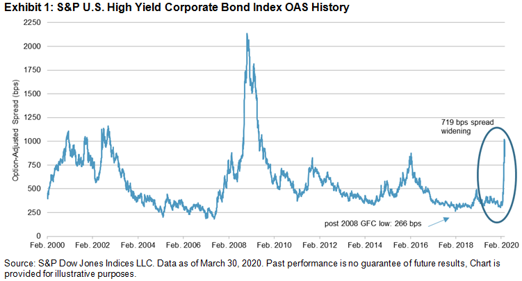 In 2020, high yield credit spreads traded stable at the tight end up until the first half of February, reflecting persistent yield chasing (see Exhibit 1). However, since then, global risk assets, driven by COVID-19 concerns, have sold off sharply. From Jan. 17, 2020, to March 23, 2020, the OAS for the S&P U.S. High Yield Corporate Bond Index widened by 719 bps from trough to peak, along with a 33% decline for the S&P 500® during the same time period.