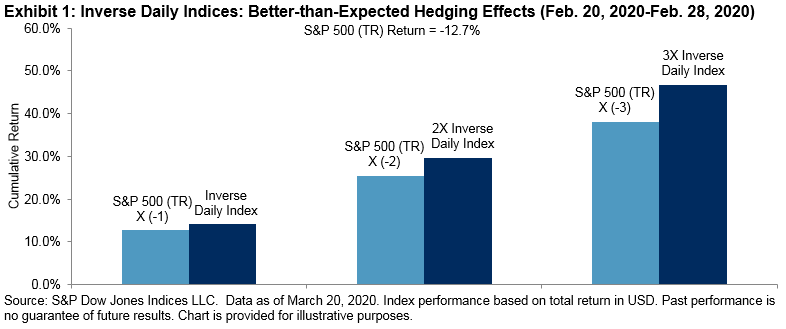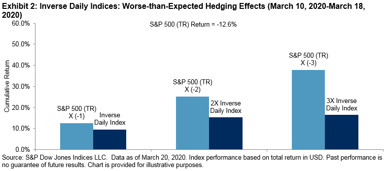 From Feb. 20, 2020, to Feb. 28, 2020, the S&P 500 was trending down every single trading day. In this case, or when the market was trending in one direction in general, the cumulative performance of the inverse daily indices tended to exceed the invert return of the index during the period.