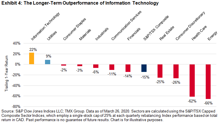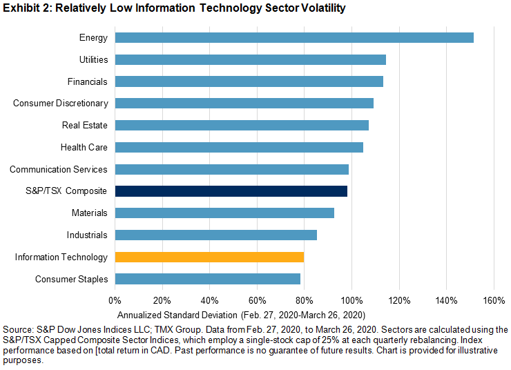 However, Information Technology continued to outperform YTD through March 26, surpassing the traditionally defensive Consumer Staples, Utilities, and Communication Services sectors. In addition, it experienced the second-lowest volatility during the crisis period out of the 11 S&P/TSX Capped Sector Indices.